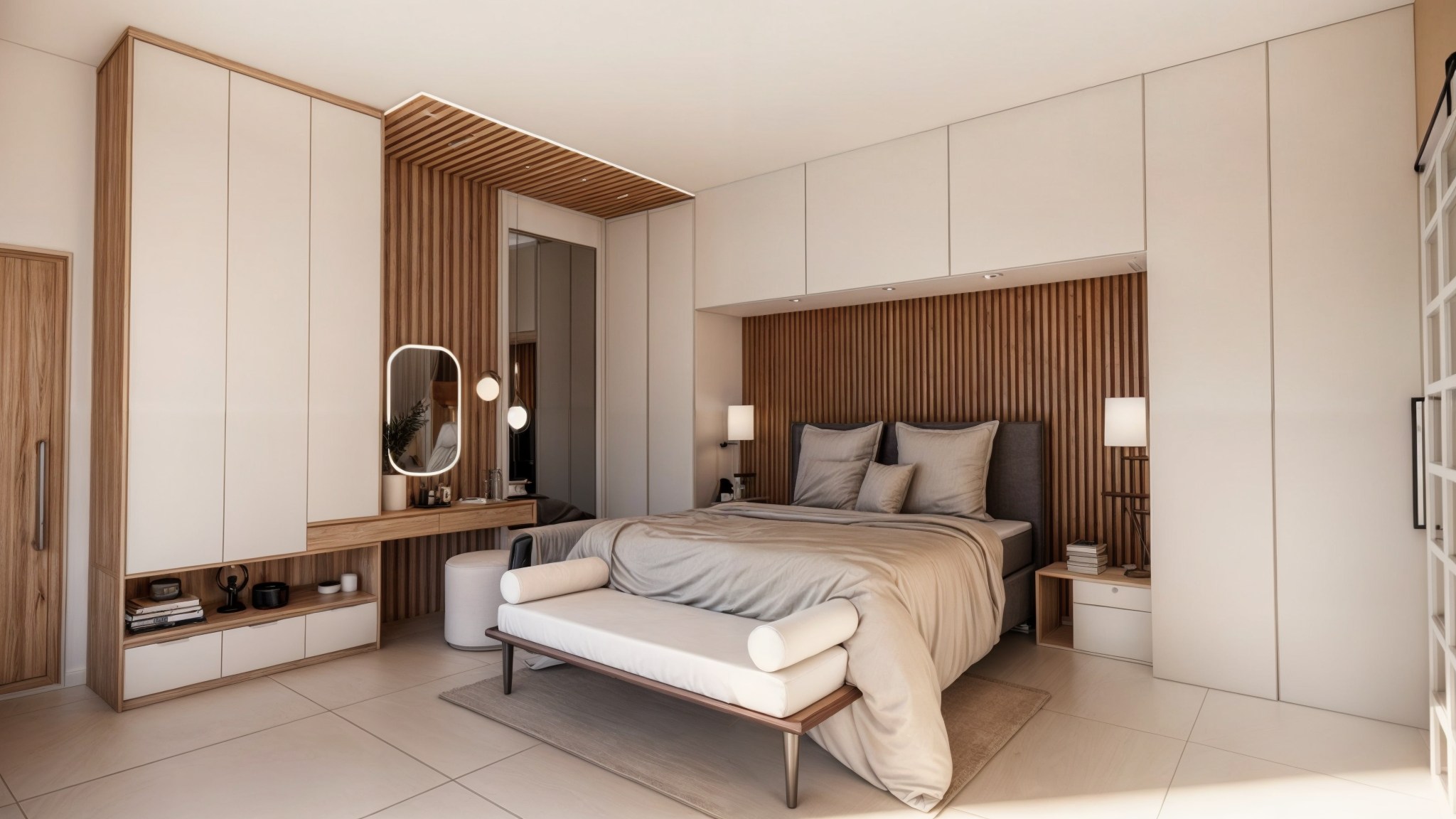 Este dormitorio combina minimalismo moderno con elementos cálidos. Se enfoca en materiales naturales, líneas limpias y funcionalidad. Los paneles de madera detrás de la cama añaden textura y calidez a una paleta mayormente neutra. La disposición es simétrica y eficiente, con mesitas de noche flotantes que evitan el desorden. La iluminación colgante sobre las mesitas aporta un contraste elegante, mientras que los grandes ventanales maximizan la luz natural y conectan con el exterior, apoyando principios biofílicos. La elección de materiales, desde la ropa de cama suave hasta el suelo de porcelanato, crea un diseño cohesivo que prioriza la comodidad y mantiene una estética clara. Es un espacio que mezcla tranquilidad y elegancia moderna, perfecto como refugio.